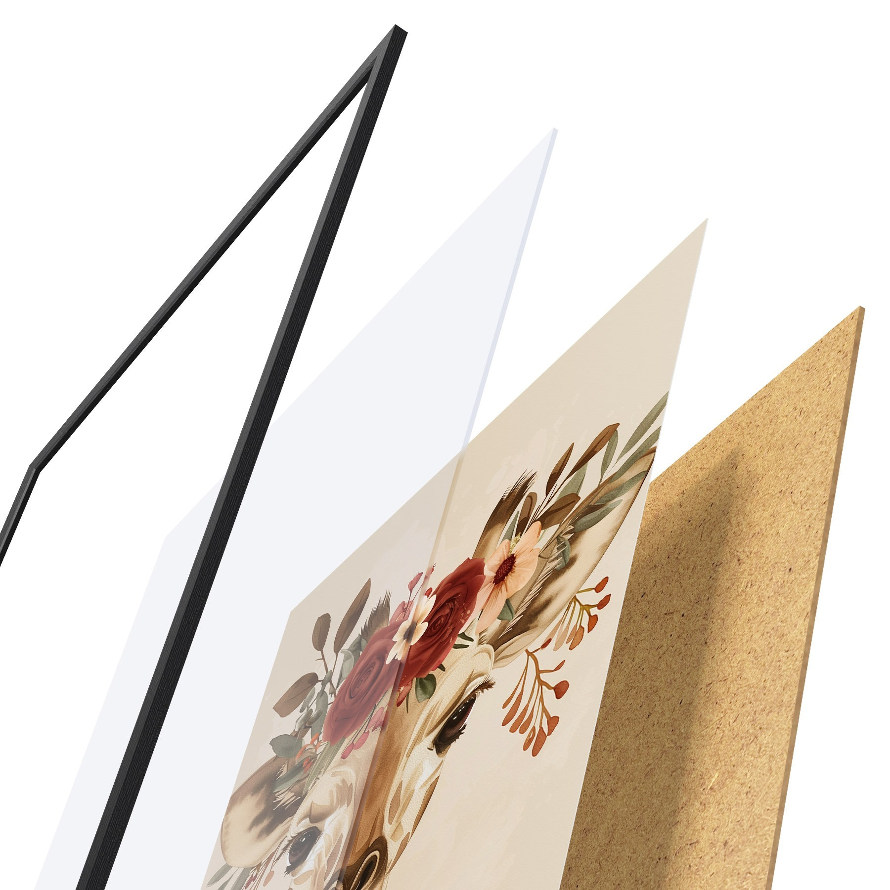 De poster bestaat uit een frame, plexiglas, geprinte afbeelding en spaanplaat achterkant. De poster kan meteen aan de muur worden gehangen dankzij de bevestigingen op de achterkant.