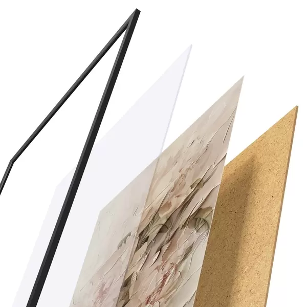 De poster bestaat uit een frame, plexiglas, geprinte afbeelding en spaanplaat achterkant. De poster kan meteen aan de muur worden gehangen dankzij de bevestigingen op de achterkant.