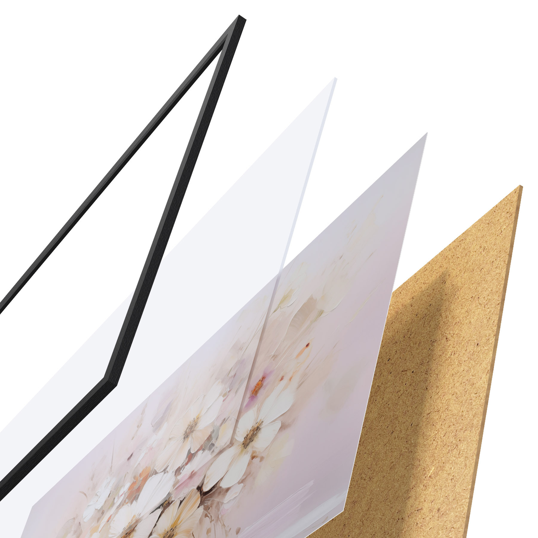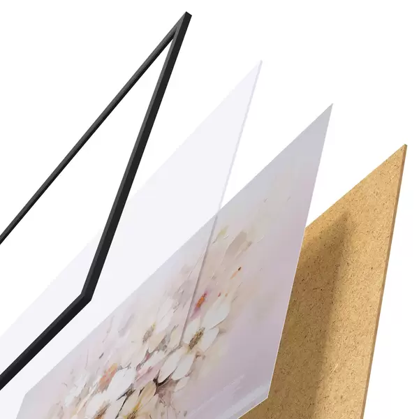 De poster bestaat uit een frame, plexiglas, geprinte afbeelding en spaanplaat achterkant. De poster kan meteen aan de muur worden gehangen dankzij de bevestigingen op de achterkant.