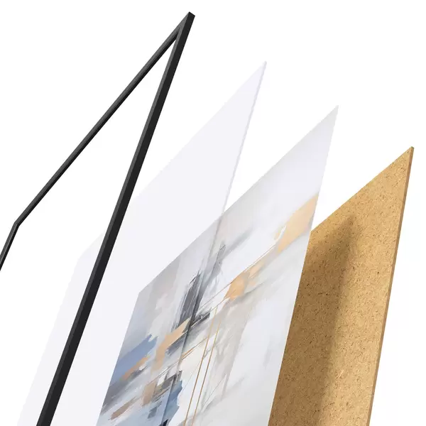 De poster bestaat uit een frame, plexiglas, geprinte afbeelding en spaanplaat achterkant. De poster kan meteen aan de muur worden gehangen dankzij de bevestigingen op de achterkant.
