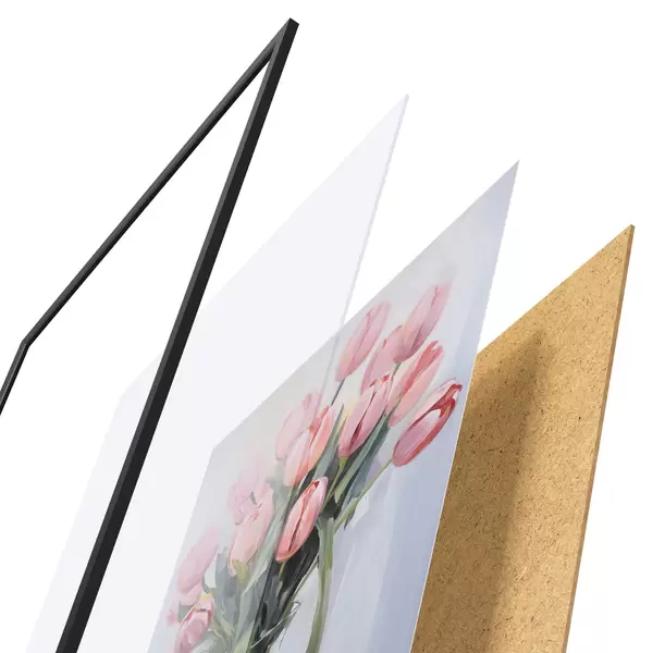 De poster bestaat uit een frame, plexiglas, geprinte afbeelding en spaanplaat achterkant. De poster kan meteen aan de muur worden gehangen dankzij de bevestigingen op de achterkant.