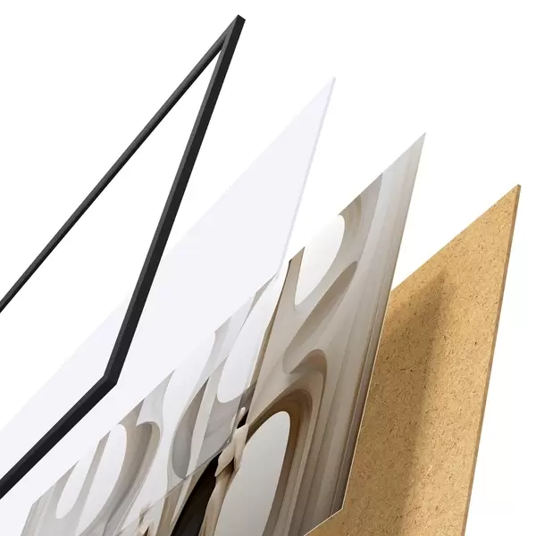 De poster bestaat uit een frame, plexiglas, geprinte afbeelding en spaanplaat achterkant. De poster kan meteen aan de muur worden gehangen dankzij de bevestigingen op de achterkant.