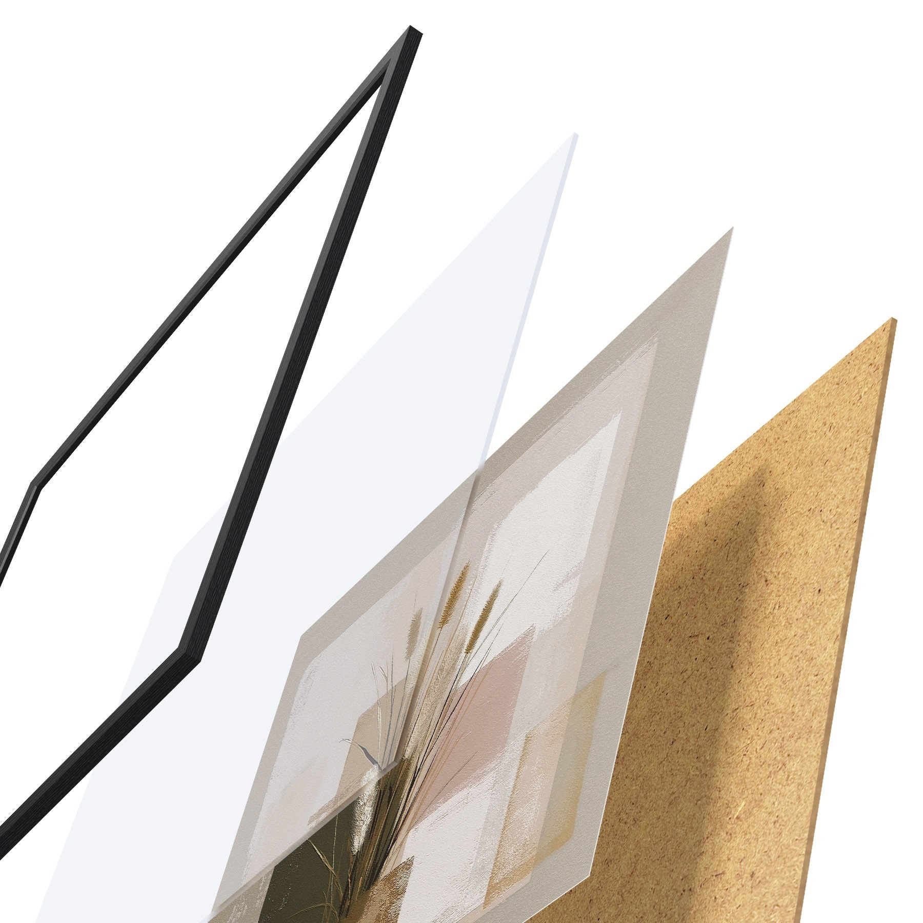 De poster bestaat uit een frame, plexiglas, geprinte afbeelding en spaanplaat achterkant. De poster kan meteen aan de muur worden gehangen dankzij de bevestigingen op de achterkant.