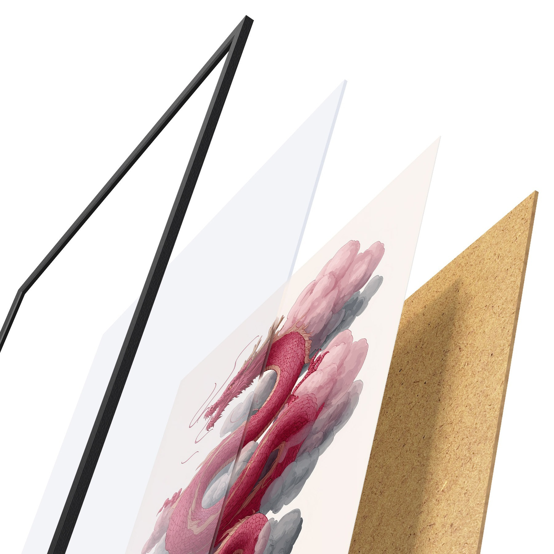 De poster bestaat uit een frame, plexiglas, geprinte afbeelding en spaanplaat achterkant. De poster kan meteen aan de muur worden gehangen dankzij de bevestigingen op de achterkant.