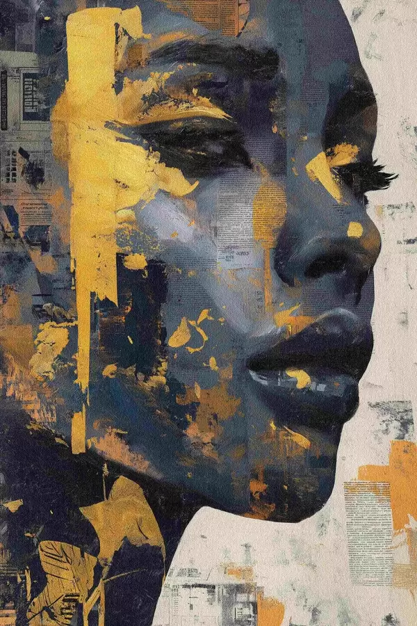 Poster Gemengde-media-portret met krantenfragmenten en decoratieve penseelstreken Nr f45420