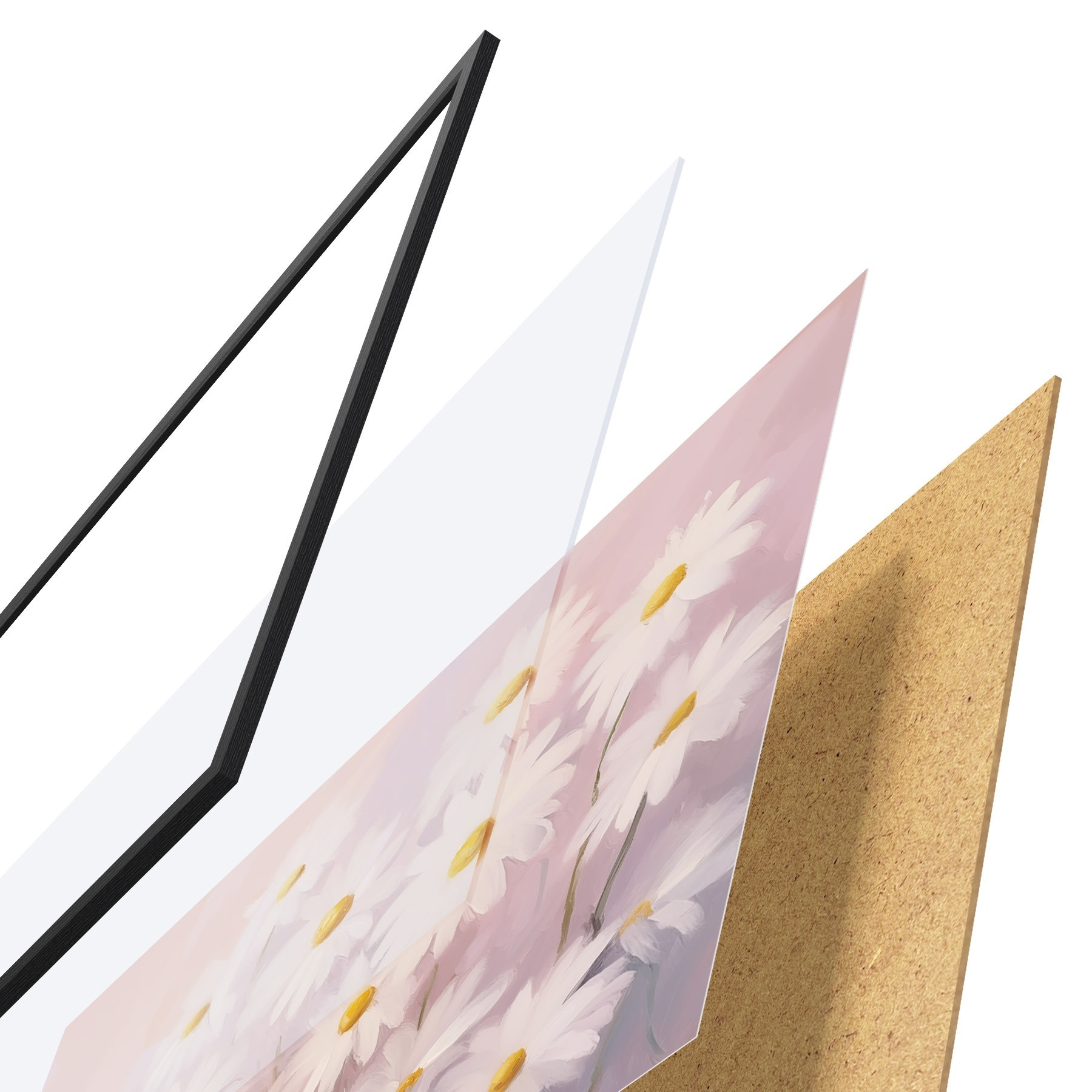 De poster bestaat uit een frame, plexiglas, geprinte afbeelding en spaanplaat achterkant. De poster kan meteen aan de muur worden gehangen dankzij de bevestigingen op de achterkant.