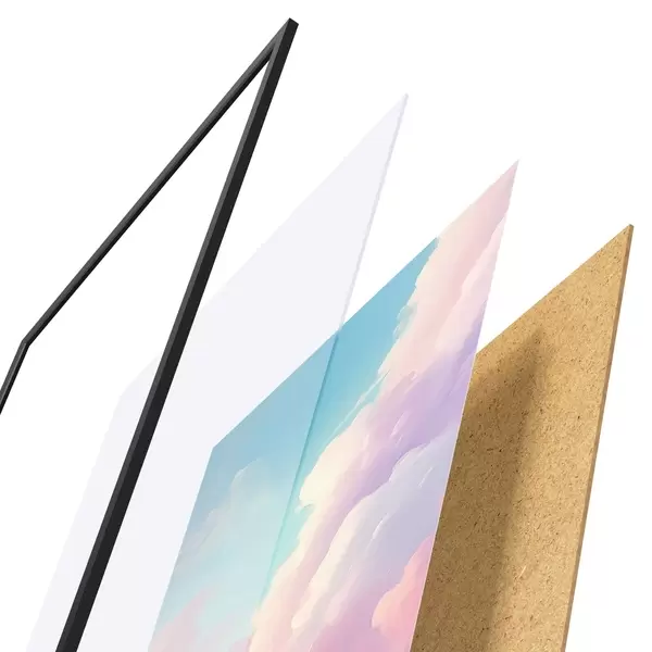 De poster bestaat uit een frame, plexiglas, geprinte afbeelding en spaanplaat achterkant. De poster kan meteen aan de muur worden gehangen dankzij de bevestigingen op de achterkant.
