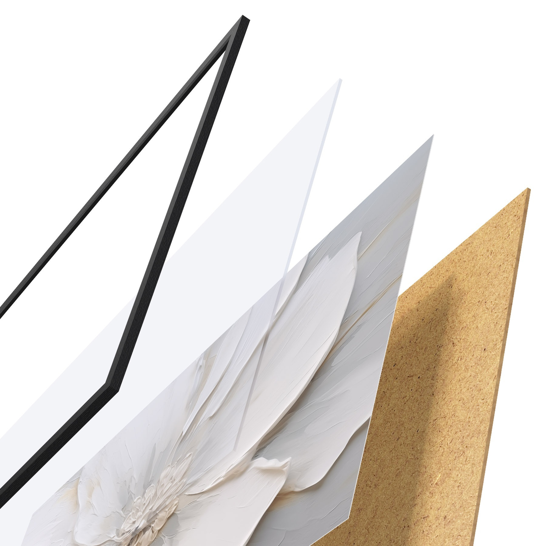 De poster bestaat uit een frame, plexiglas, geprinte afbeelding en spaanplaat achterkant. De poster kan meteen aan de muur worden gehangen dankzij de bevestigingen op de achterkant.
