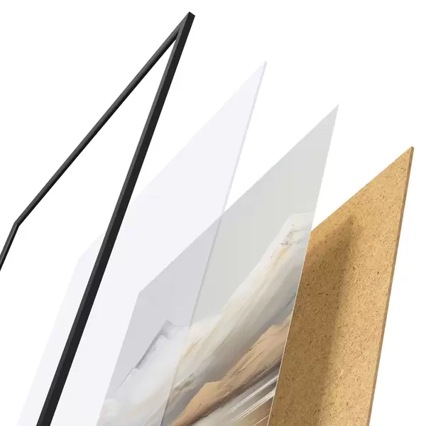 De poster bestaat uit een frame, plexiglas, geprinte afbeelding en spaanplaat achterkant. De poster kan meteen aan de muur worden gehangen dankzij de bevestigingen op de achterkant.