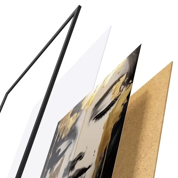 De poster bestaat uit een frame, plexiglas, geprinte afbeelding en spaanplaat achterkant. De poster kan meteen aan de muur worden gehangen dankzij de bevestigingen op de achterkant.