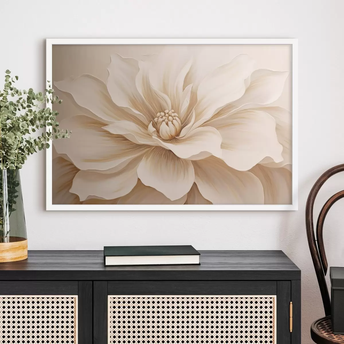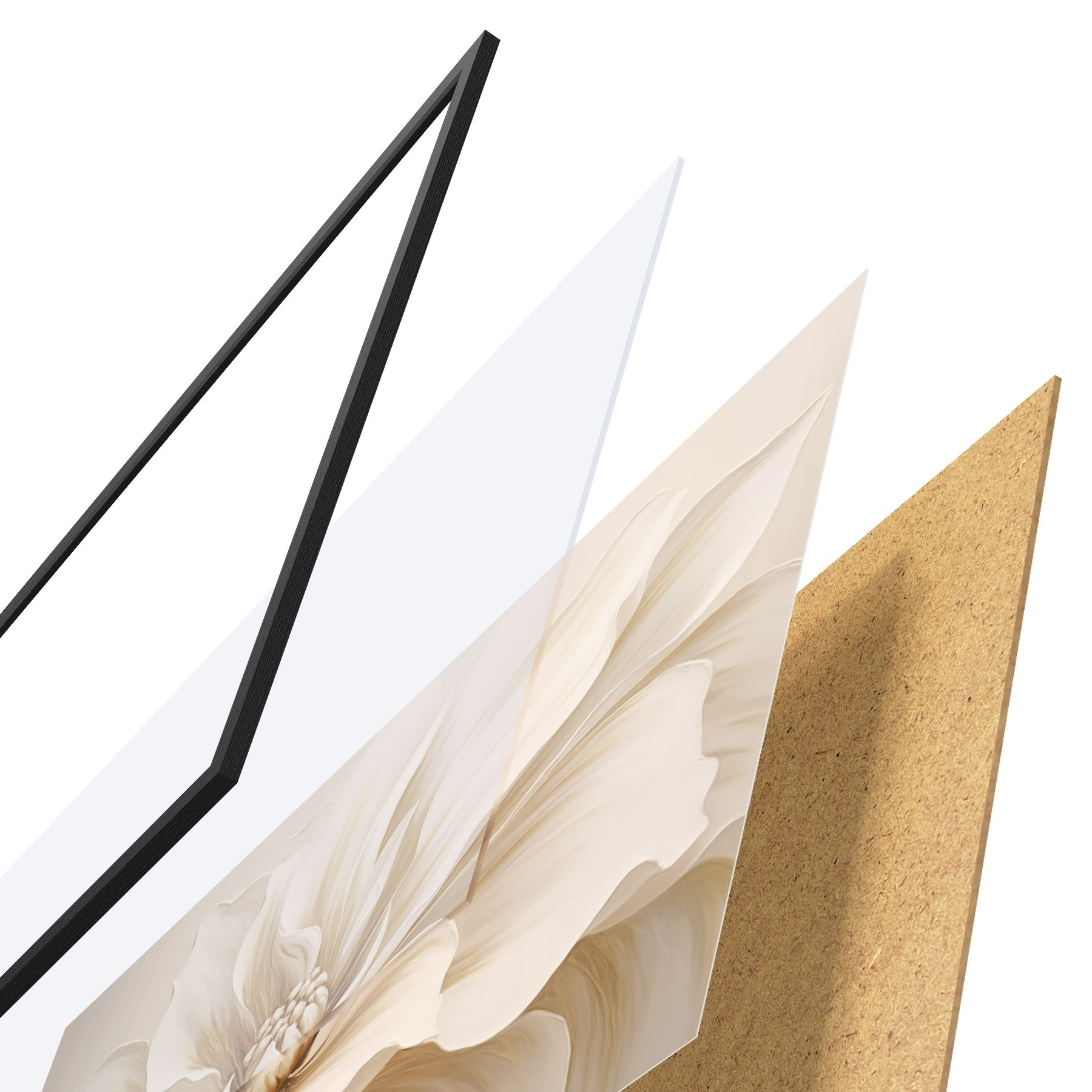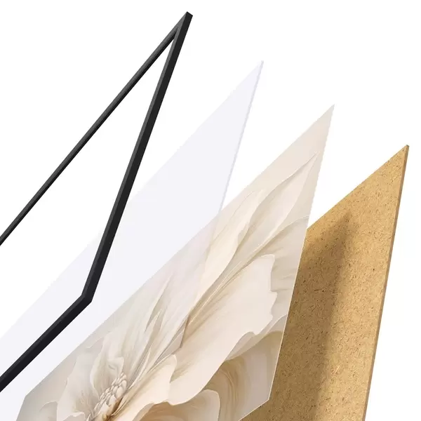 De poster bestaat uit een frame, plexiglas, geprinte afbeelding en spaanplaat achterkant. De poster kan meteen aan de muur worden gehangen dankzij de bevestigingen op de achterkant.