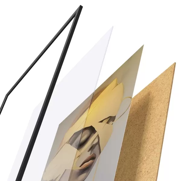 De poster bestaat uit een frame, plexiglas, geprinte afbeelding en spaanplaat achterkant. De poster kan meteen aan de muur worden gehangen dankzij de bevestigingen op de achterkant.