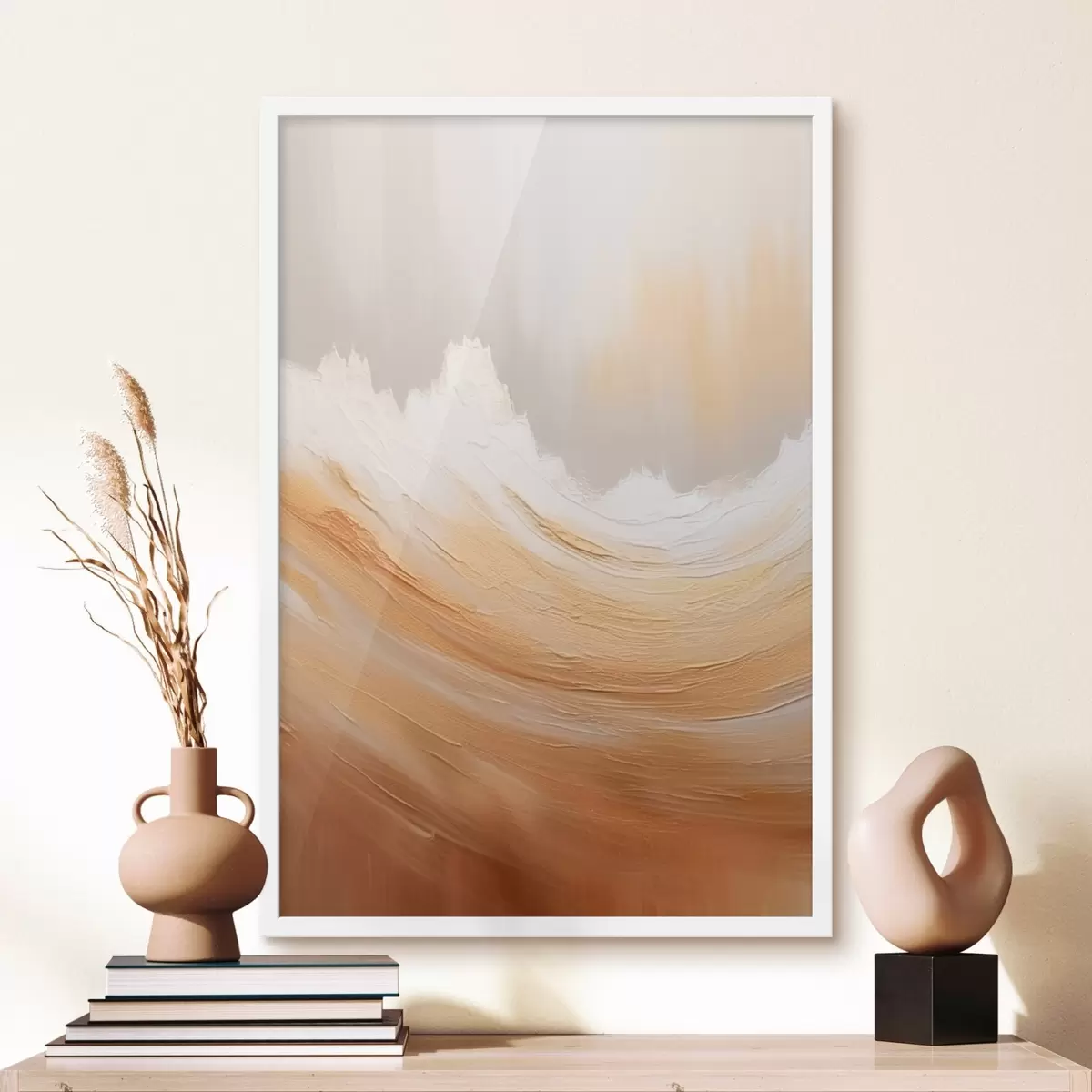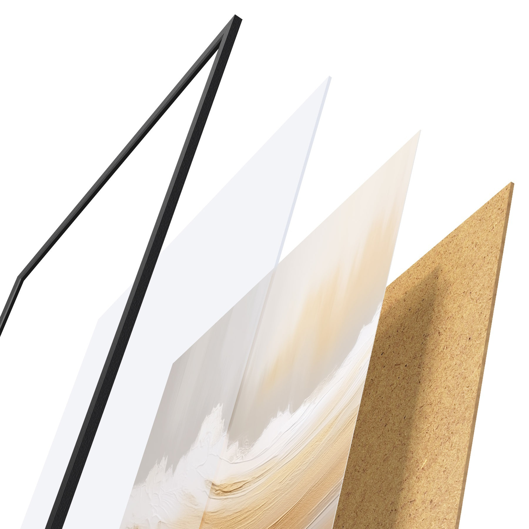 De poster bestaat uit een frame, plexiglas, geprinte afbeelding en spaanplaat achterkant. De poster kan meteen aan de muur worden gehangen dankzij de bevestigingen op de achterkant.