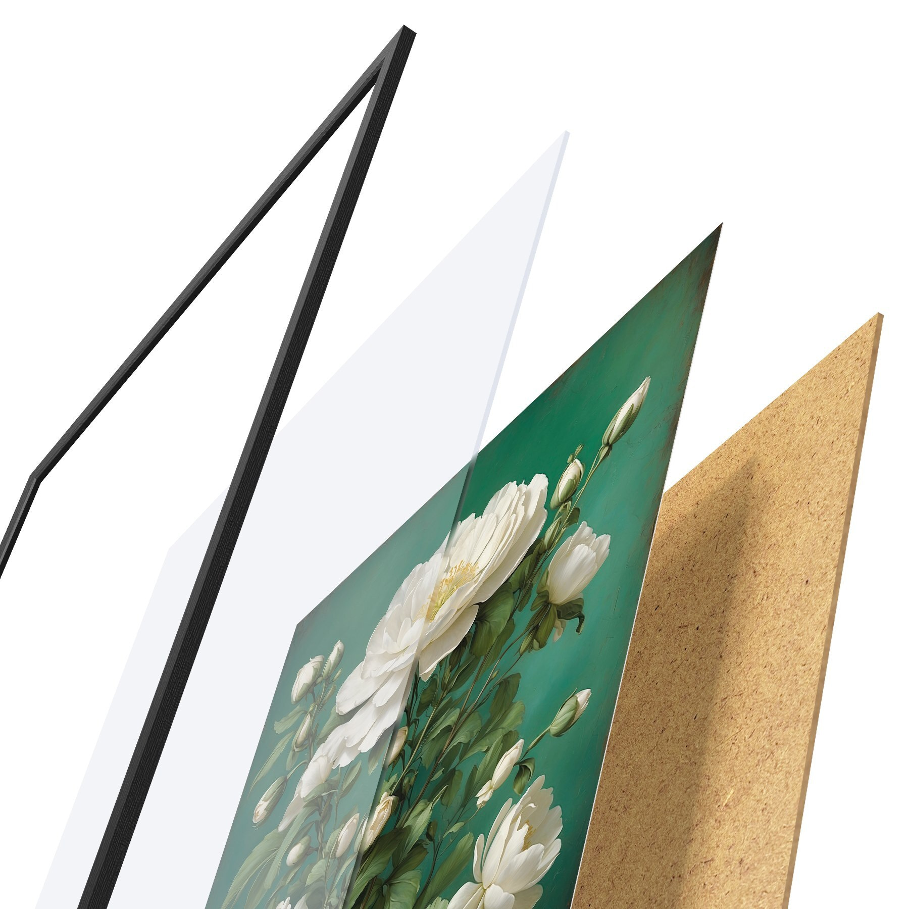 De poster bestaat uit een frame, plexiglas, geprinte afbeelding en spaanplaat achterkant. De poster kan meteen aan de muur worden gehangen dankzij de bevestigingen op de achterkant.
