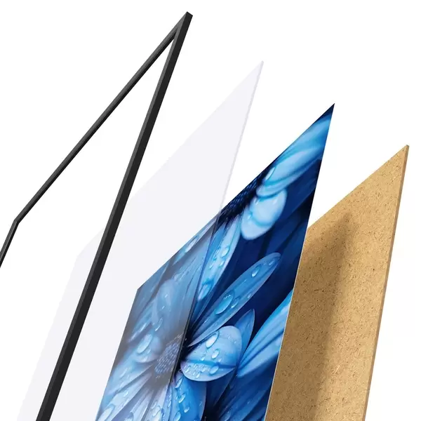 De poster bestaat uit een frame, plexiglas, geprinte afbeelding en spaanplaat achterkant. De poster kan meteen aan de muur worden gehangen dankzij de bevestigingen op de achterkant.