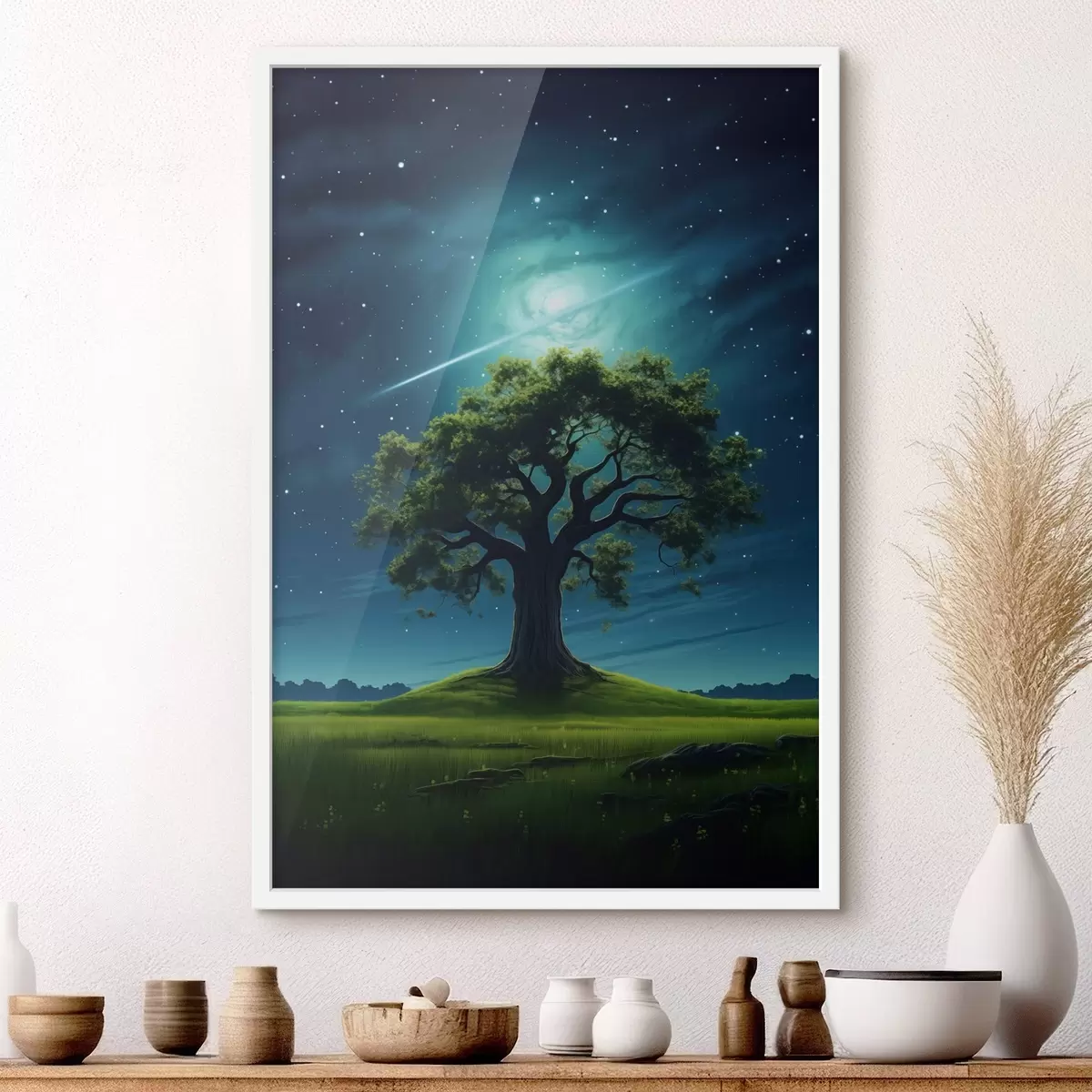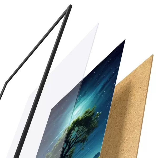 De poster bestaat uit een frame, plexiglas, geprinte afbeelding en spaanplaat achterkant. De poster kan meteen aan de muur worden gehangen dankzij de bevestigingen op de achterkant.