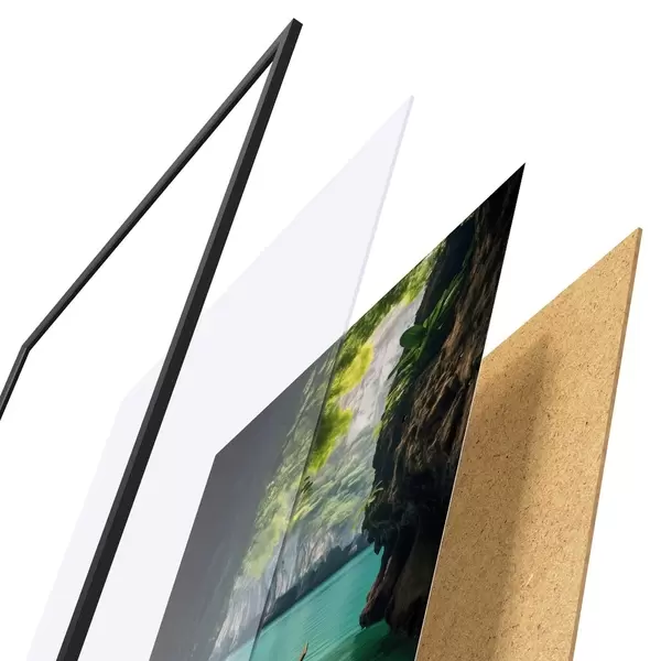 De poster bestaat uit een frame, plexiglas, geprinte afbeelding en spaanplaat achterkant. De poster kan meteen aan de muur worden gehangen dankzij de bevestigingen op de achterkant.