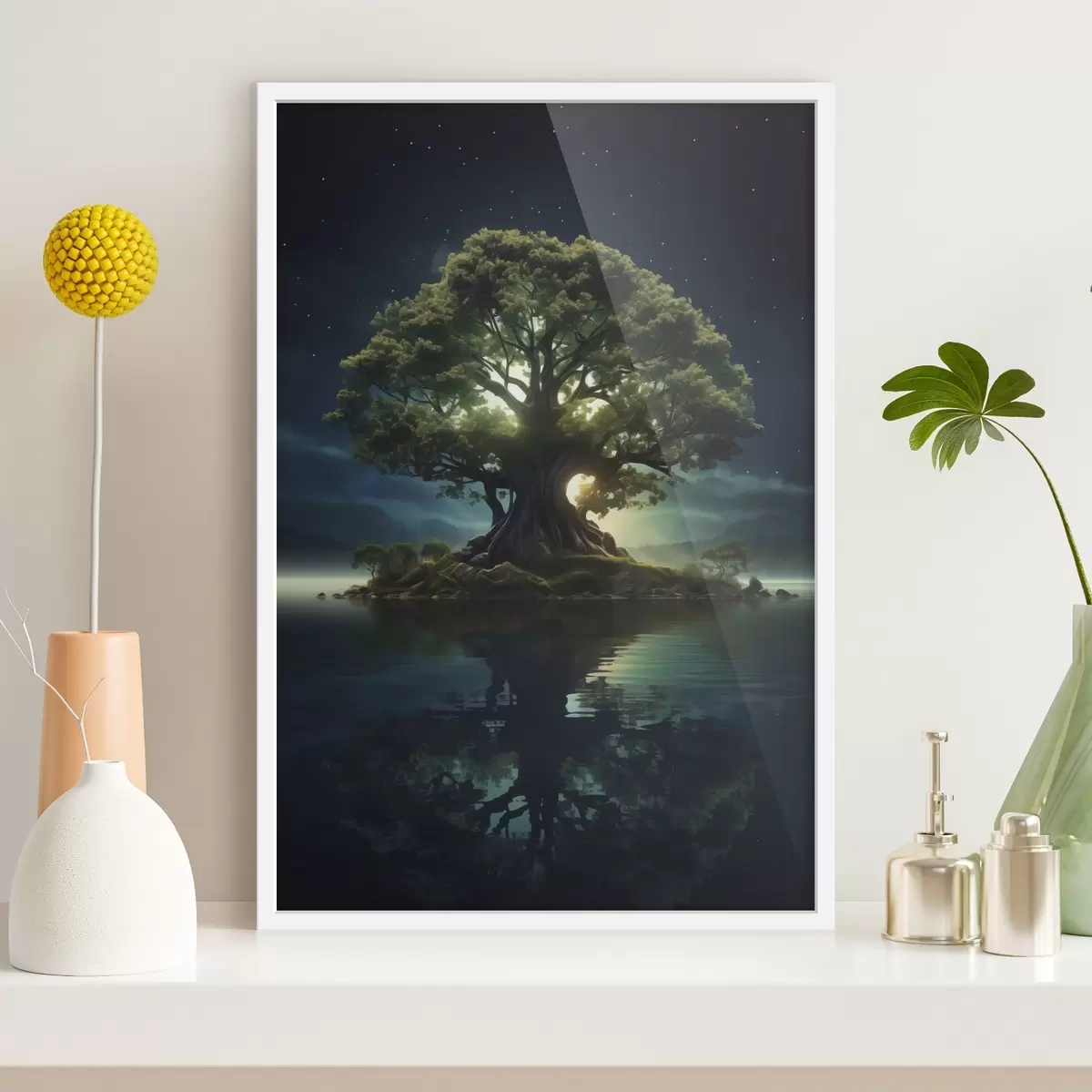 De poster bestaat uit een frame, plexiglas, geprinte afbeelding en spaanplaat achterkant. De poster kan meteen aan de muur worden gehangen dankzij de bevestigingen op de achterkant.