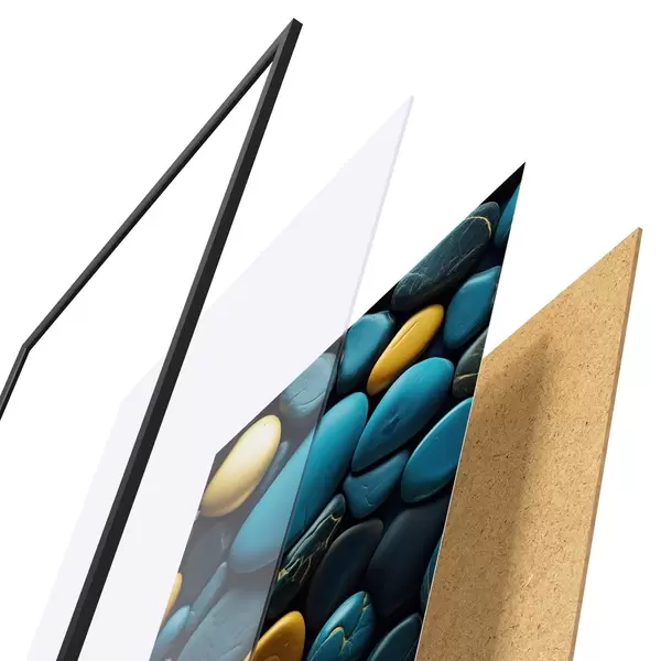 De poster bestaat uit een frame, plexiglas, geprinte afbeelding en spaanplaat achterkant. De poster kan meteen aan de muur worden gehangen dankzij de bevestigingen op de achterkant.