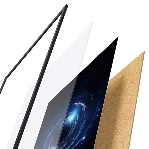 De poster bestaat uit een frame, plexiglas, geprinte afbeelding en spaanplaat achterkant. De poster kan meteen aan de muur worden gehangen dankzij de bevestigingen op de achterkant.