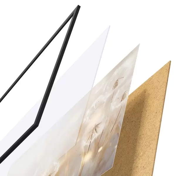 De poster bestaat uit een frame, plexiglas, geprinte afbeelding en spaanplaat achterkant. De poster kan meteen aan de muur worden gehangen dankzij de bevestigingen op de achterkant.