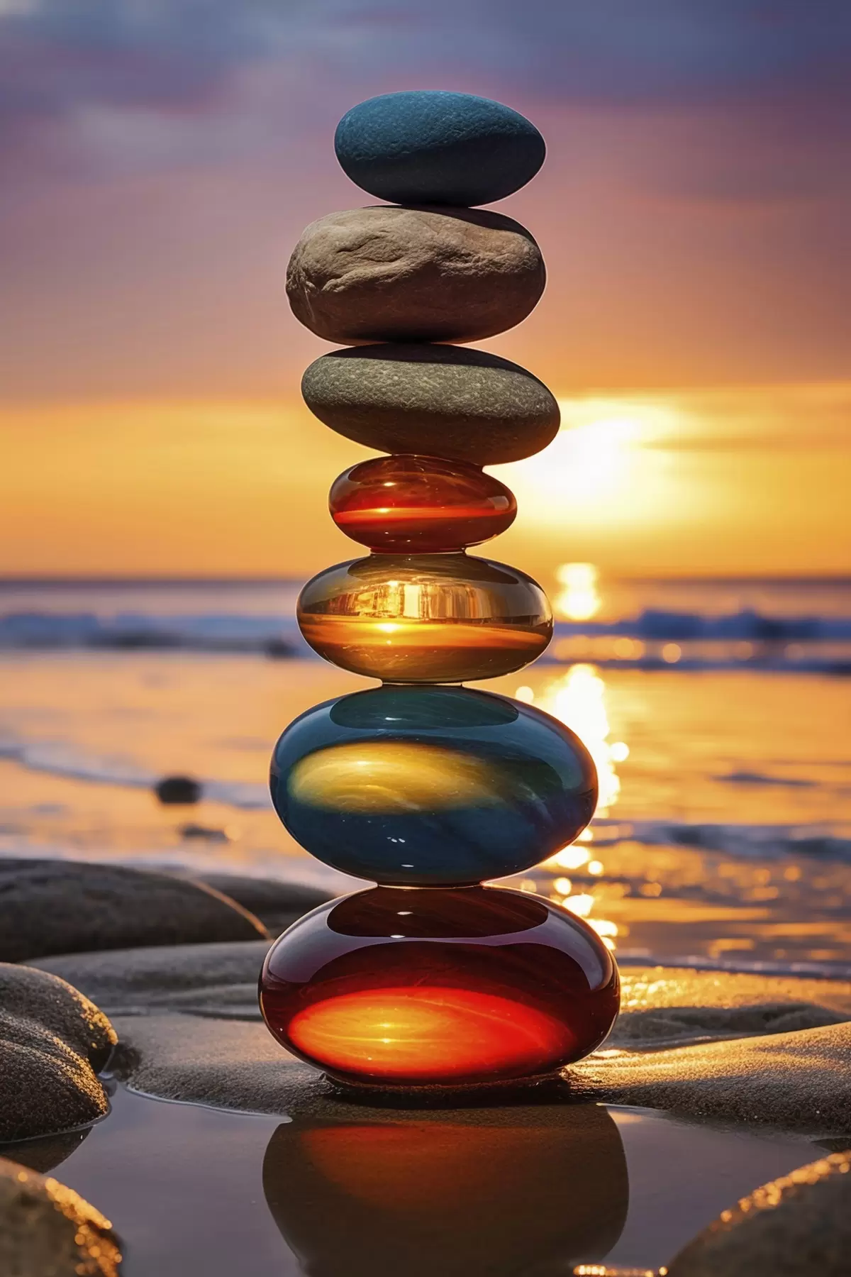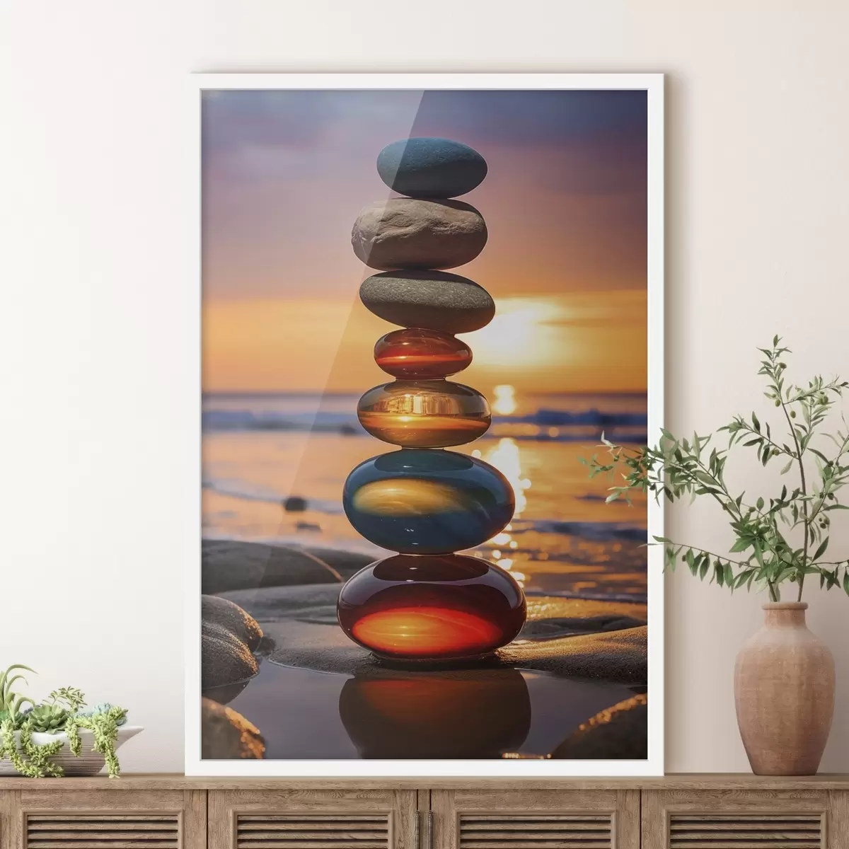 Poster Gestapelde stenen tegen de achtergrond van de zonsondergang Nr f45520