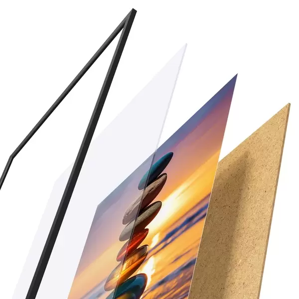 De poster bestaat uit een frame, plexiglas, geprinte afbeelding en spaanplaat achterkant. De poster kan meteen aan de muur worden gehangen dankzij de bevestigingen op de achterkant.