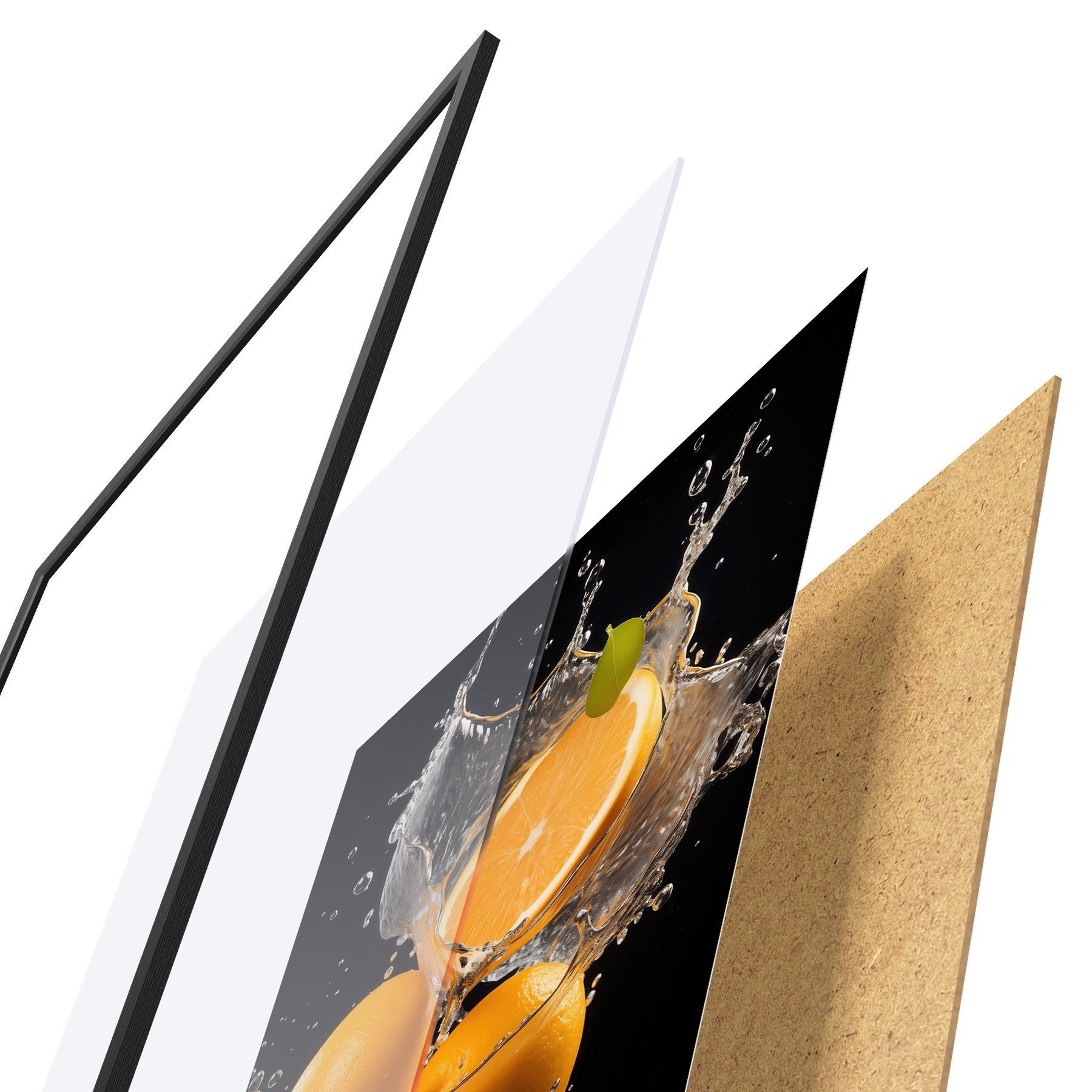 De poster bestaat uit een frame, plexiglas, geprinte afbeelding en spaanplaat achterkant. De poster kan meteen aan de muur worden gehangen dankzij de bevestigingen op de achterkant.