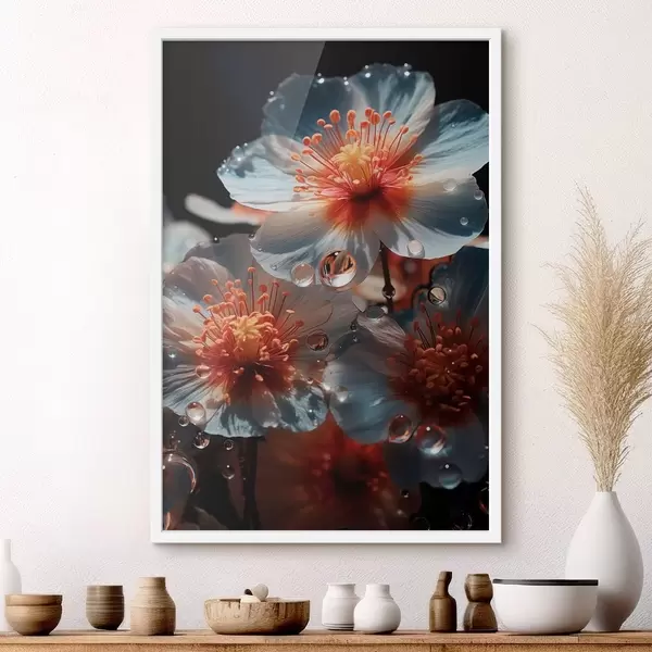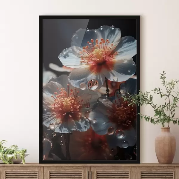 Poster Bloemmotief: schoonheid van bloemblaadjes met dauw op een donkere achtergrond Nr f45529