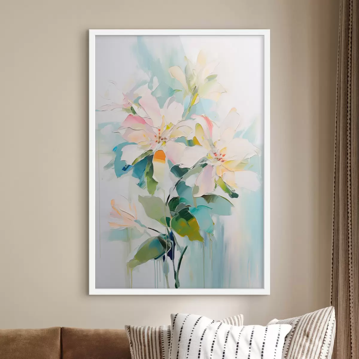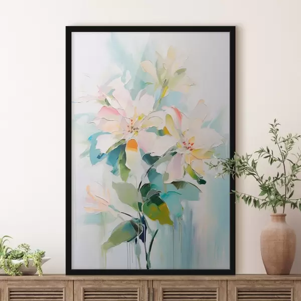 Poster Bloemen met kleurrijke accenten, groene bladeren, zachte penseelstreken olieverf imitatie, lichtblauwe achtergrond Nr f45549