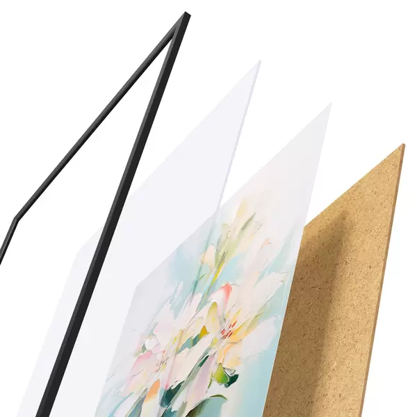 De poster bestaat uit een frame, plexiglas, geprinte afbeelding en spaanplaat achterkant. De poster kan meteen aan de muur worden gehangen dankzij de bevestigingen op de achterkant.