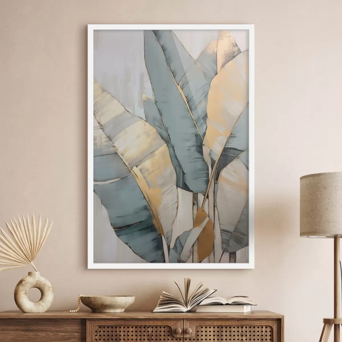 Poster Gedempte blauwe, grijze en gele bananenbladeren met zichtbare penseelstreken, op een witte abstracte achtergrond Nr f45552