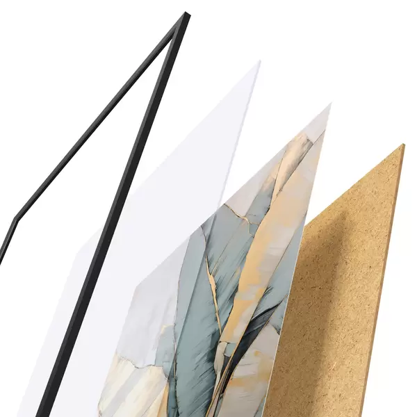 De poster bestaat uit een frame, plexiglas, geprinte afbeelding en spaanplaat achterkant. De poster kan meteen aan de muur worden gehangen dankzij de bevestigingen op de achterkant.