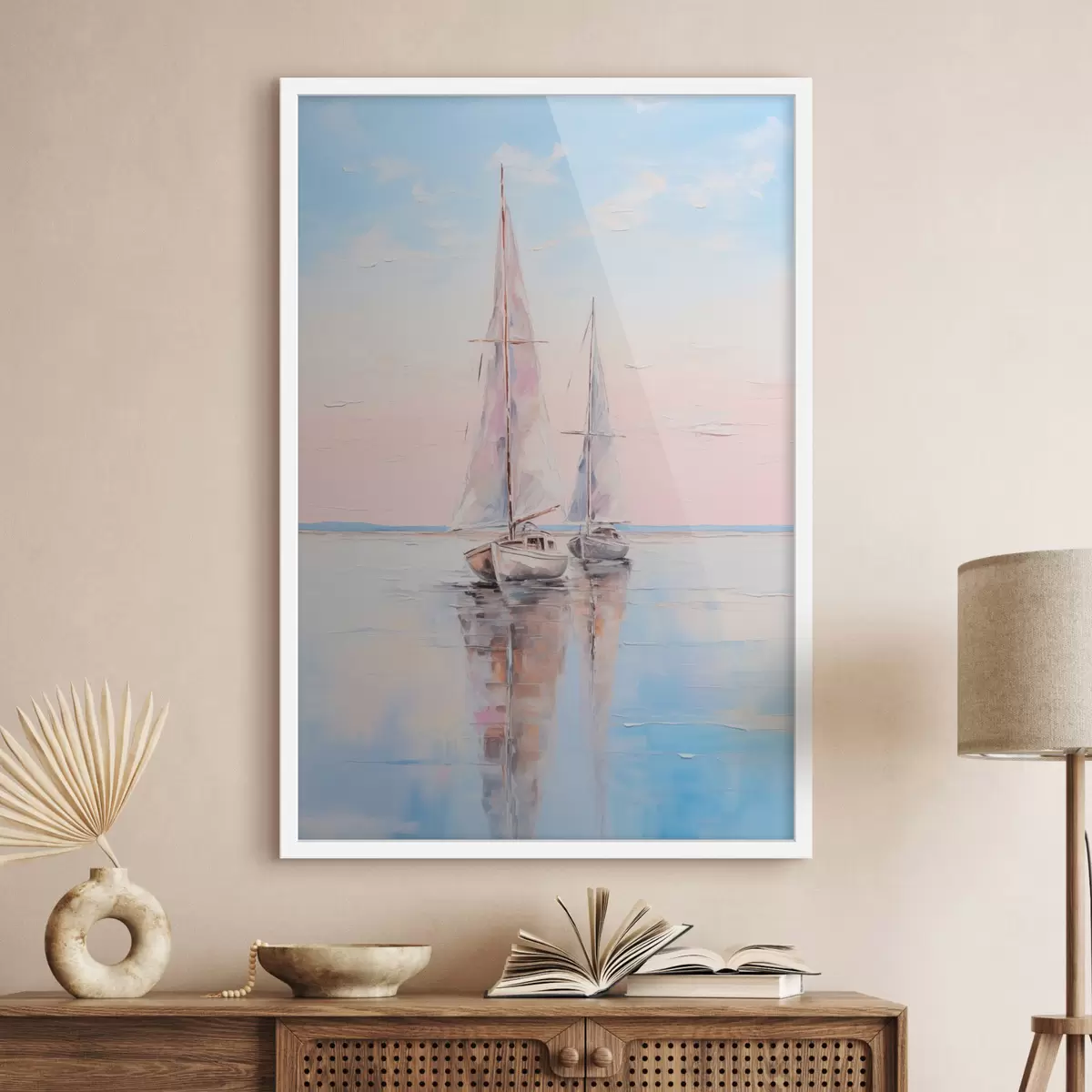 Poster Zeilboten met roze zeilen drijvend op een kalme zee, reflecties van de boten in het water, zachte pastelkleuren Nr f45558