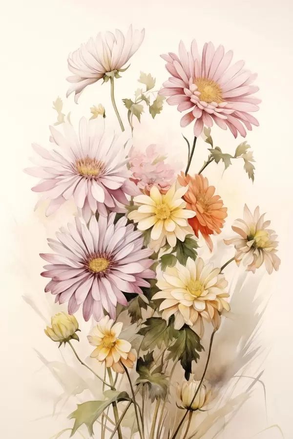 Poster Een boeket kleurrijke bloemen, zachte aquarelstijl, op een lichte achtergrond f45559
