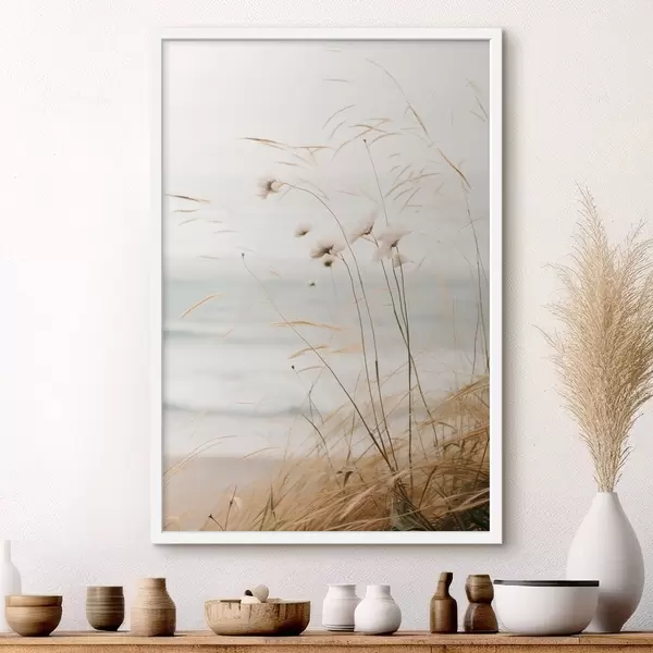 Poster Wat katoengras en ander droog gras voor een vage zee, zacht en gedempt kleurenpalet Nr f45562