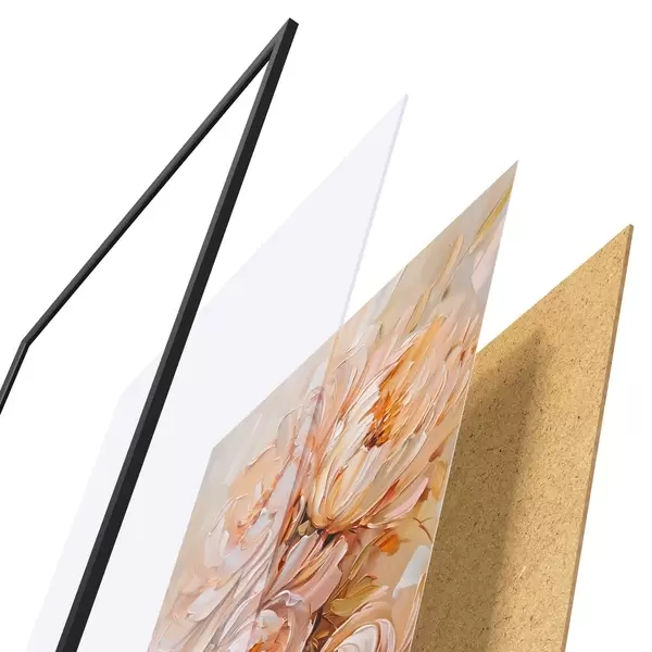 De poster bestaat uit een frame, plexiglas, geprinte afbeelding en spaanplaat achterkant. De poster kan meteen aan de muur worden gehangen dankzij de bevestigingen op de achterkant.