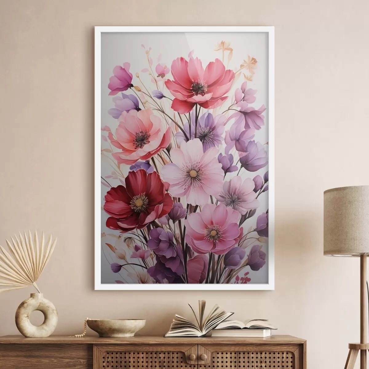 Poster Delicaat boeket van roze en lila klaprozen op een lichte achtergrond, aquarelstijl Nr f45601