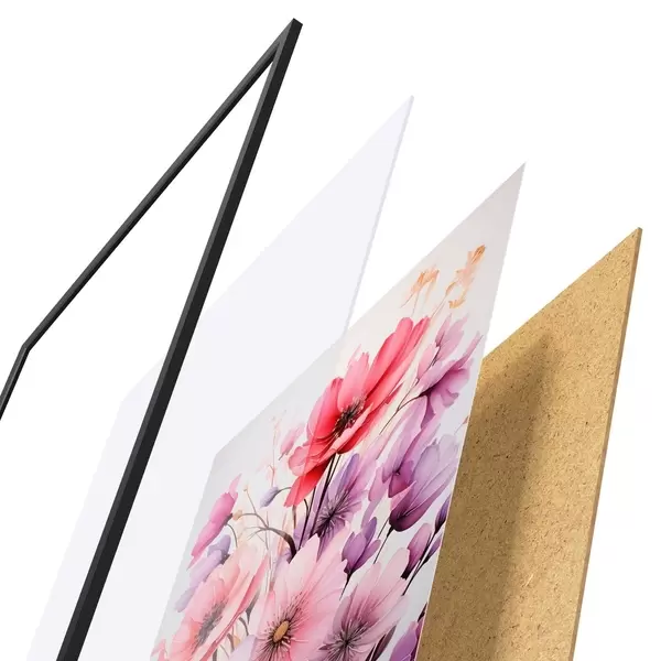 De poster bestaat uit een frame, plexiglas, geprinte afbeelding en spaanplaat achterkant. De poster kan meteen aan de muur worden gehangen dankzij de bevestigingen op de achterkant.