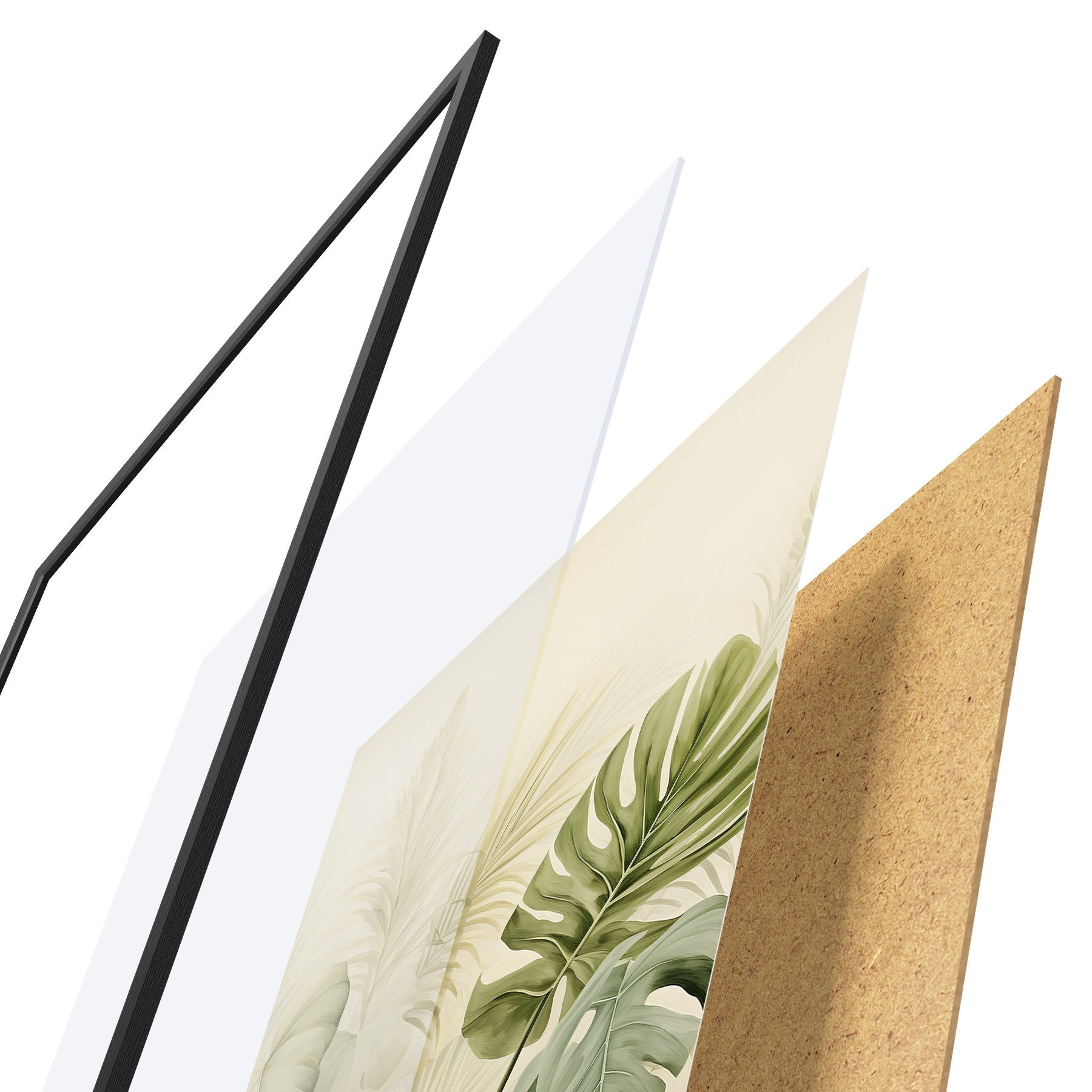 De poster bestaat uit een frame, plexiglas, geprinte afbeelding en spaanplaat achterkant. De poster kan meteen aan de muur worden gehangen dankzij de bevestigingen op de achterkant.
