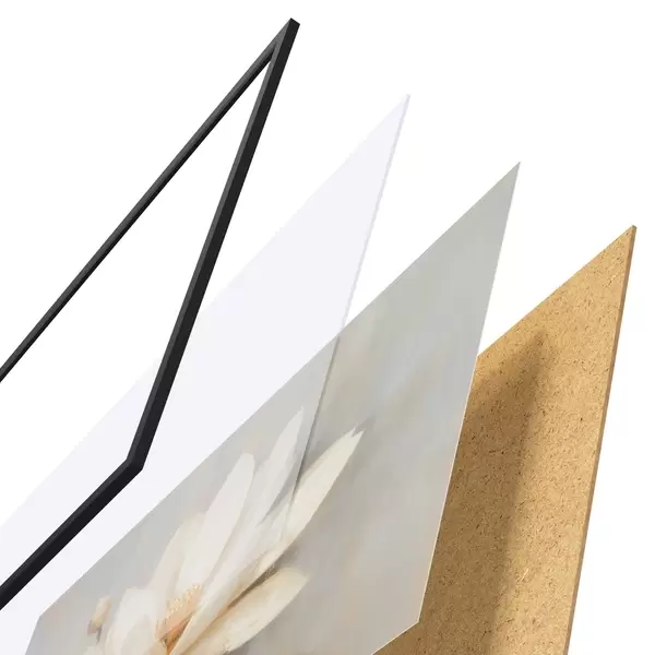 De poster bestaat uit een frame, plexiglas, geprinte afbeelding en spaanplaat achterkant. De poster kan meteen aan de muur worden gehangen dankzij de bevestigingen op de achterkant.