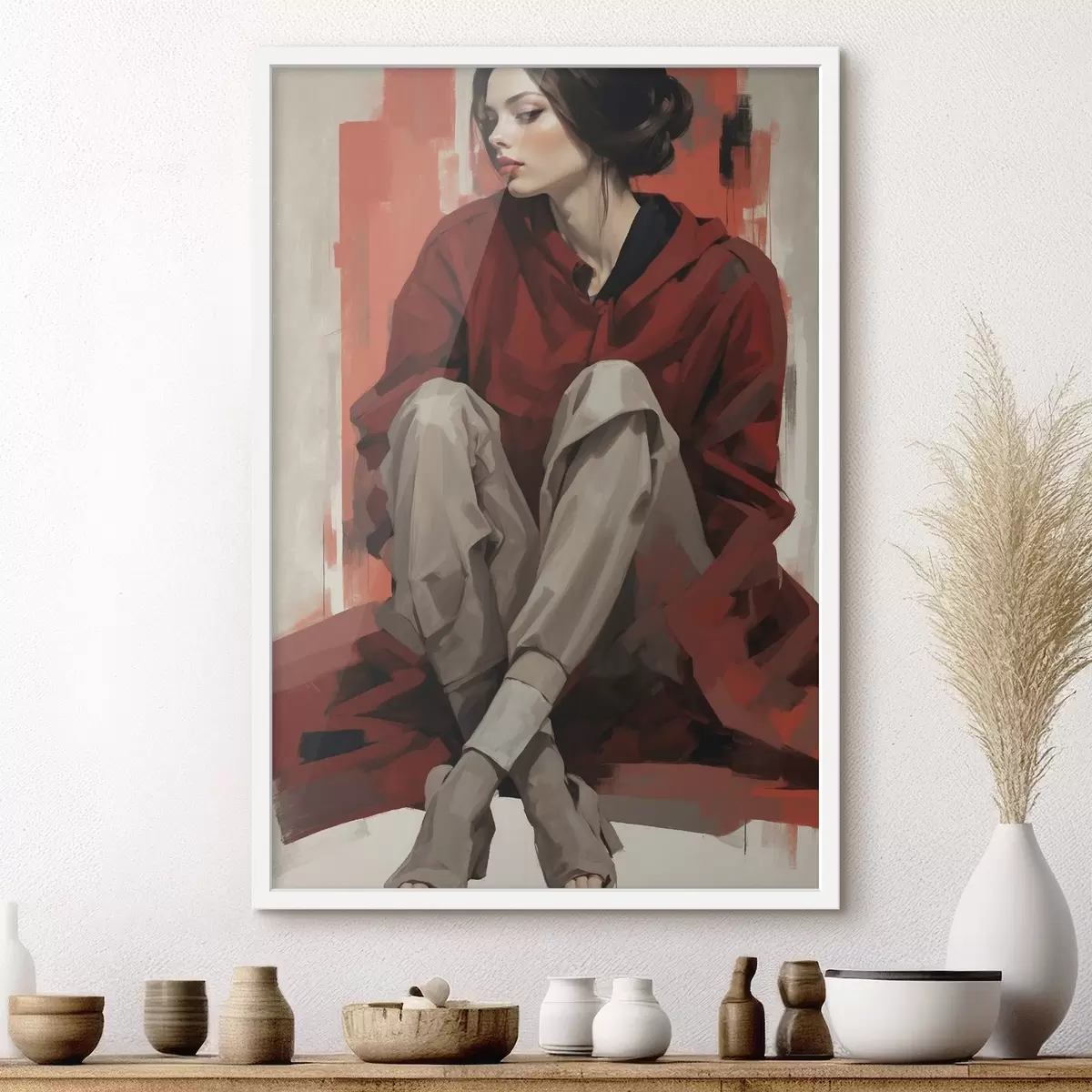 Poster Meisje in een rode mantel zittend met gevouwen benen f45624
