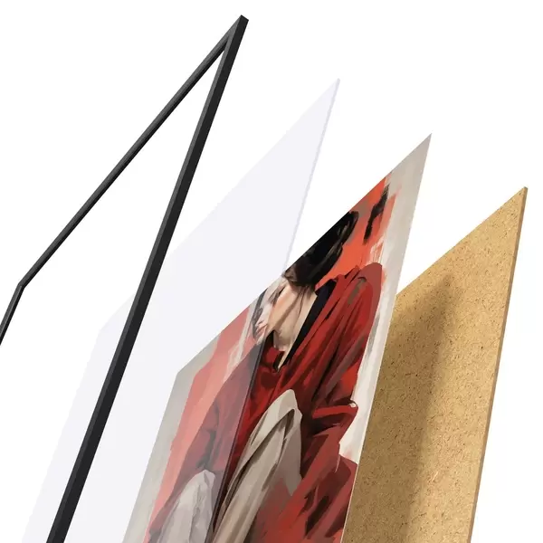De poster bestaat uit een frame, plexiglas, geprinte afbeelding en spaanplaat achterkant. De poster kan meteen aan de muur worden gehangen dankzij de bevestigingen op de achterkant.