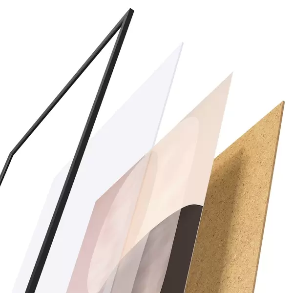 De poster bestaat uit een frame, plexiglas, geprinte afbeelding en spaanplaat achterkant. De poster kan meteen aan de muur worden gehangen dankzij de bevestigingen op de achterkant.