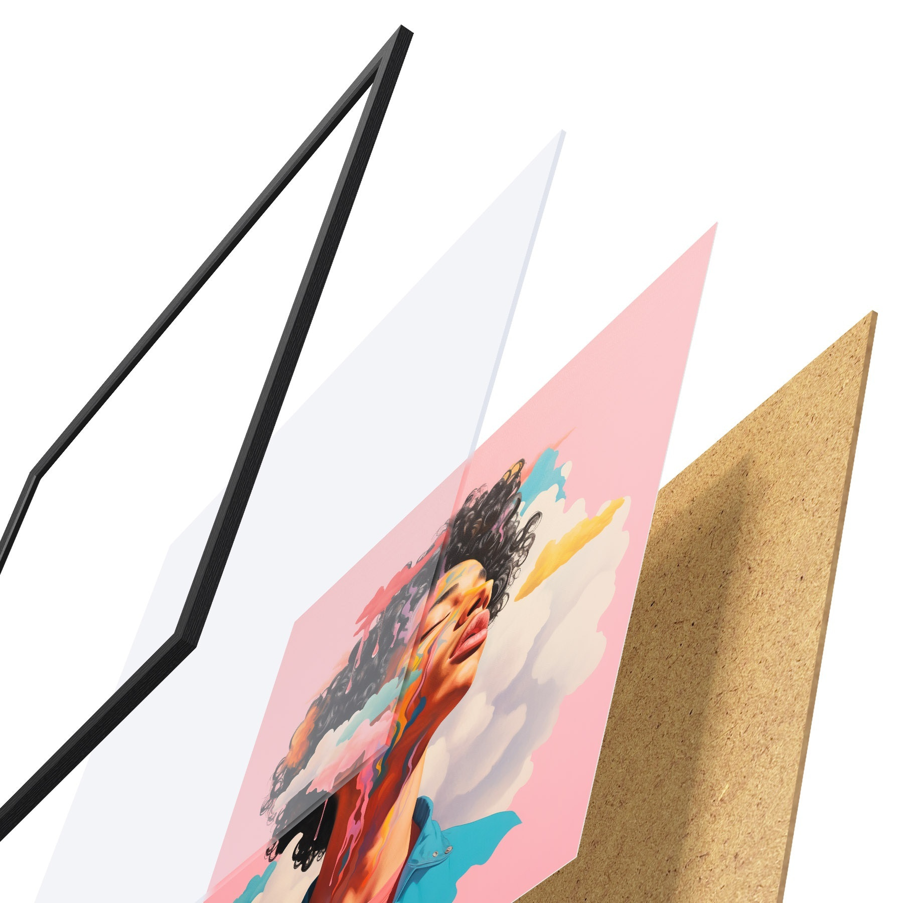 De poster bestaat uit een frame, plexiglas, geprinte afbeelding en spaanplaat achterkant. De poster kan meteen aan de muur worden gehangen dankzij de bevestigingen op de achterkant.