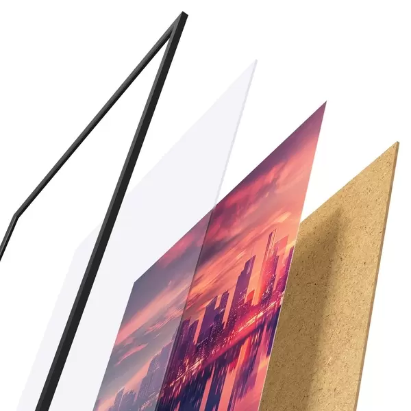 De poster bestaat uit een frame, plexiglas, geprinte afbeelding en spaanplaat achterkant. De poster kan meteen aan de muur worden gehangen dankzij de bevestigingen op de achterkant.