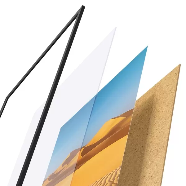 De poster bestaat uit een frame, plexiglas, geprinte afbeelding en spaanplaat achterkant. De poster kan meteen aan de muur worden gehangen dankzij de bevestigingen op de achterkant.