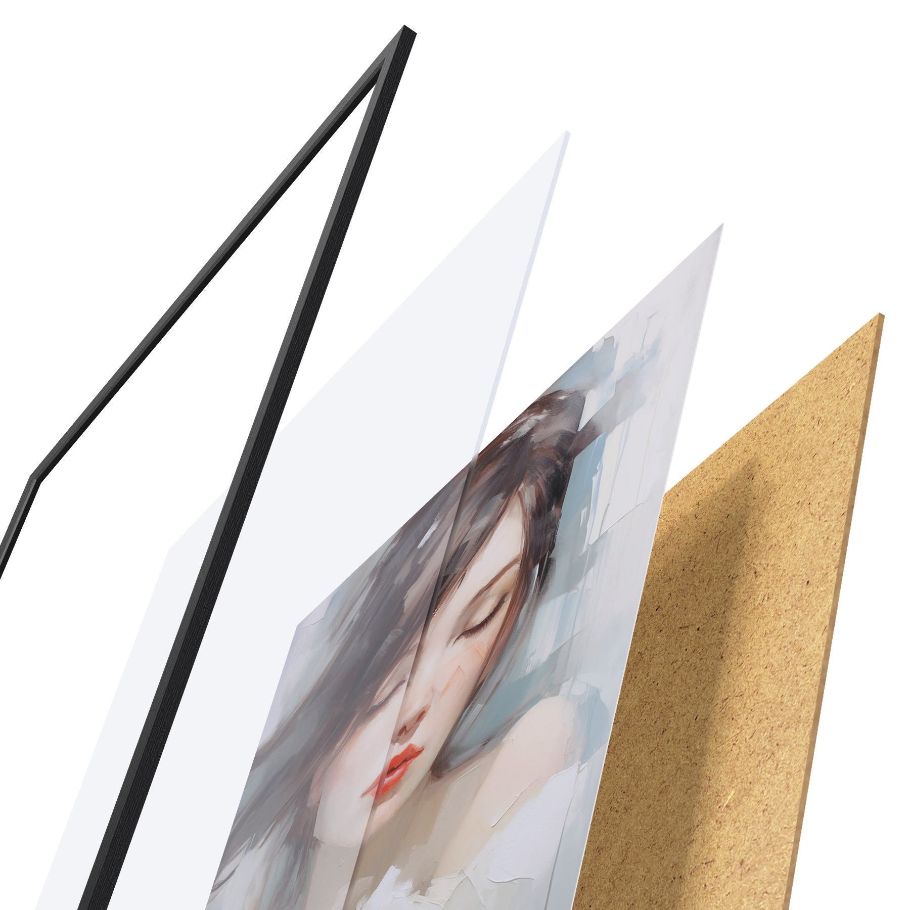De poster bestaat uit een frame, plexiglas, geprinte afbeelding en spaanplaat achterkant. De poster kan meteen aan de muur worden gehangen dankzij de bevestigingen op de achterkant.