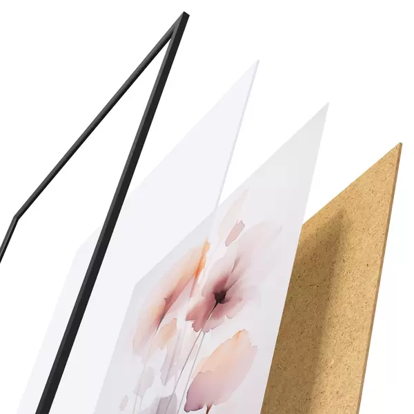 De poster bestaat uit een frame, plexiglas, geprinte afbeelding en spaanplaat achterkant. De poster kan meteen aan de muur worden gehangen dankzij de bevestigingen op de achterkant.