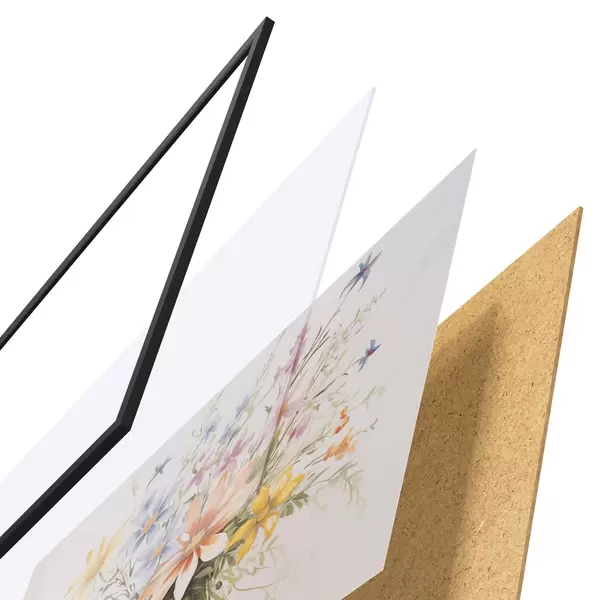 De poster bestaat uit een frame, plexiglas, geprinte afbeelding en spaanplaat achterkant. De poster kan meteen aan de muur worden gehangen dankzij de bevestigingen op de achterkant.